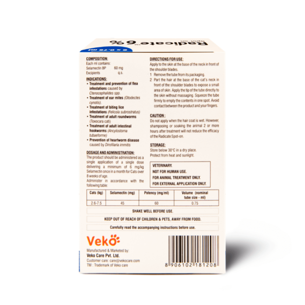 - Selamectin: The active ingredient in Radicate, selamectin, is a highly effective parasiticide that works by killing fleas, mites, and intestinal worms, as well as preventing heartworm larvae from developing. It’s trusted for its broad protection and safety profile.