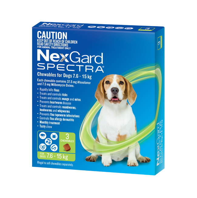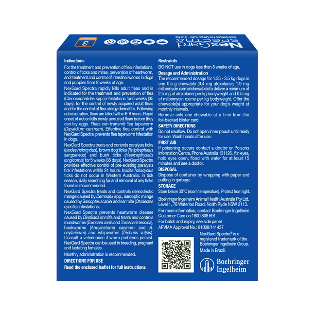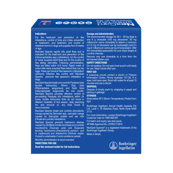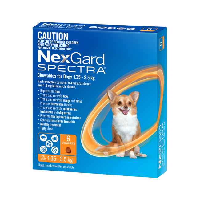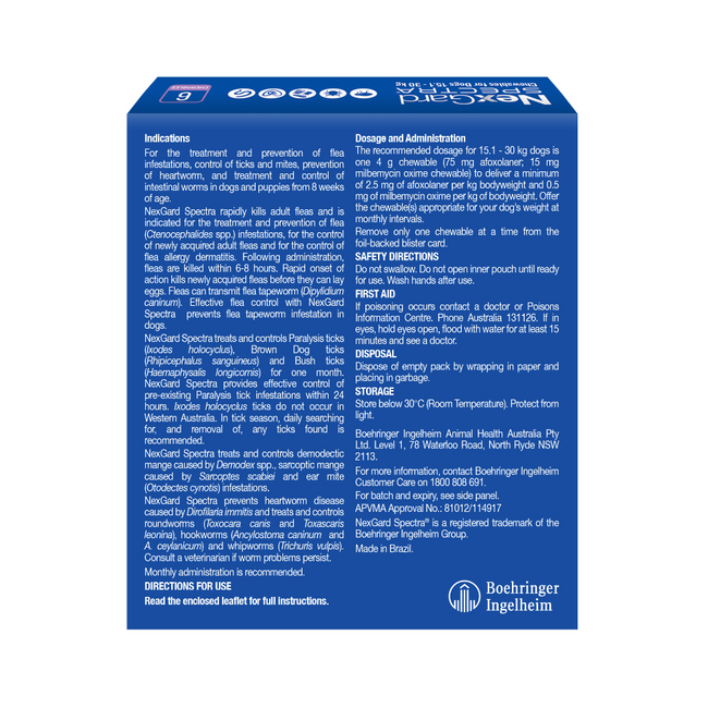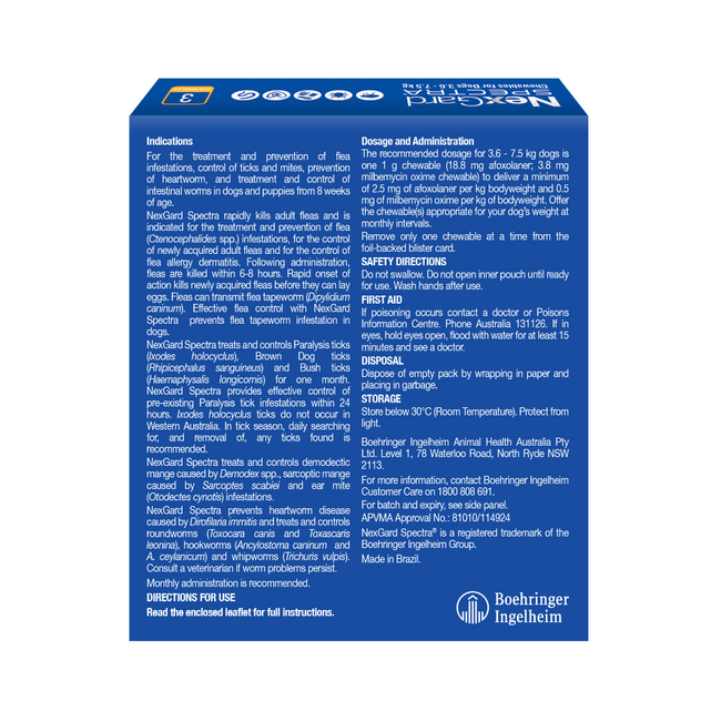 For puppies, make sure they are at least 8 weeks old and weigh a minimum of 2 kg before starting NexGard Spectra. Keep out of reach of children, and store in a cool, dry place.