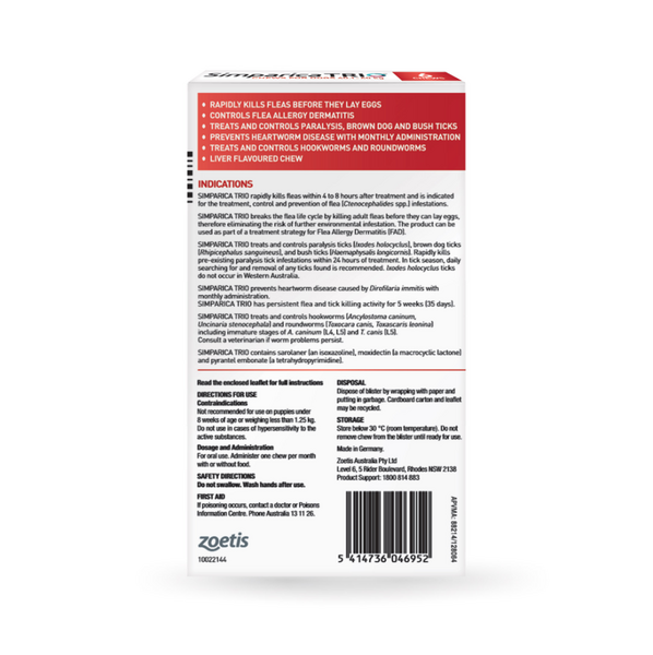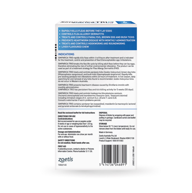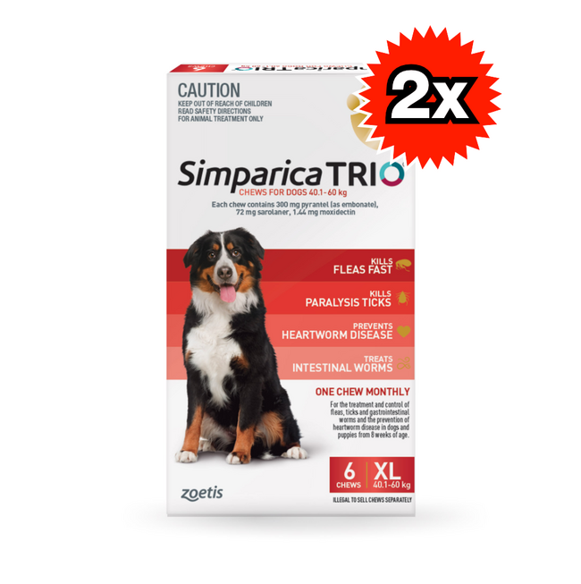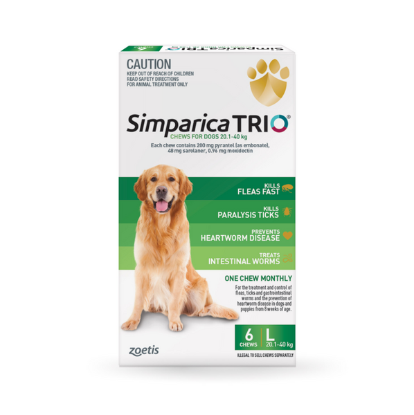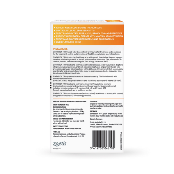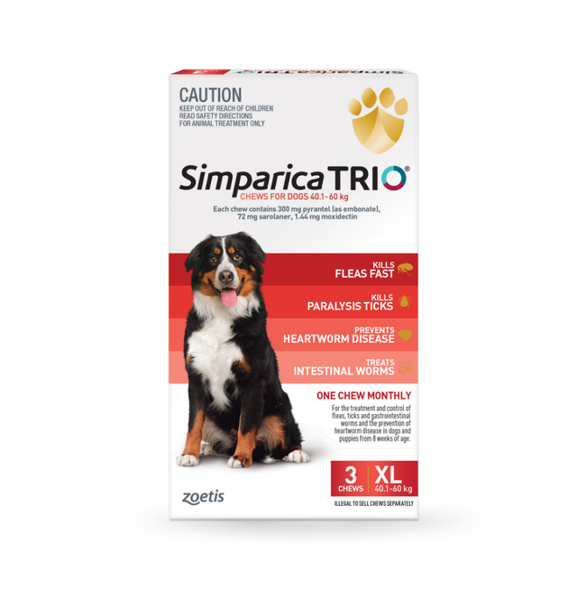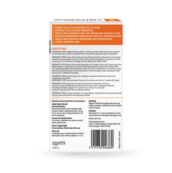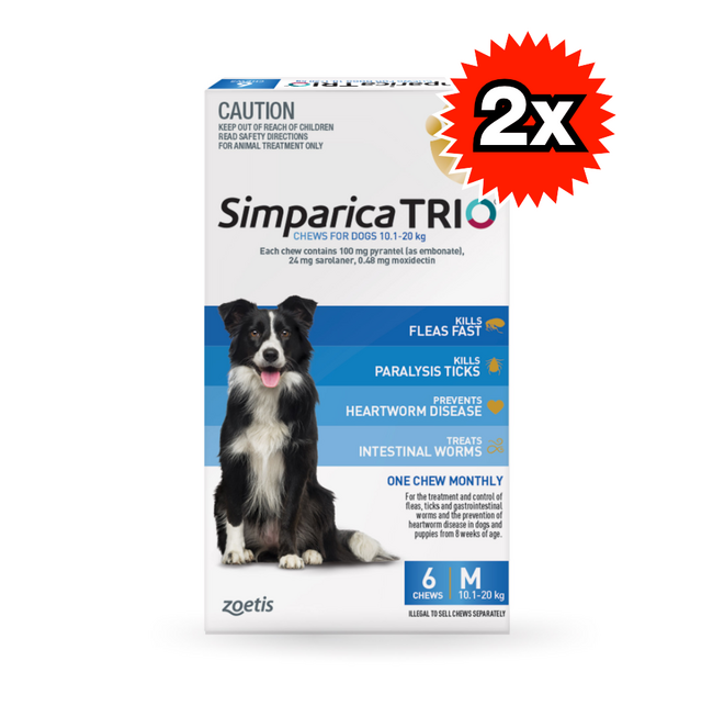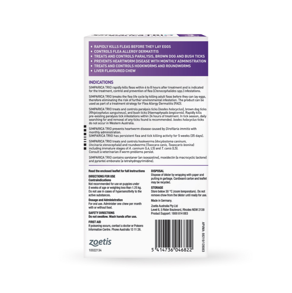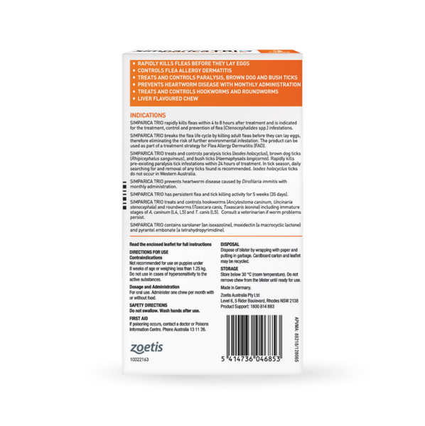 Simparica Trio is an all-in-one chewable tablet designed to protect your dog from multiple parasites, including fleas, ticks, heartworms, roundworms, and hookworms. It provides monthly protection and is a convenient way to safeguard your dog's health, combining powerful ingredients into a single, easy-to-administer treatment.